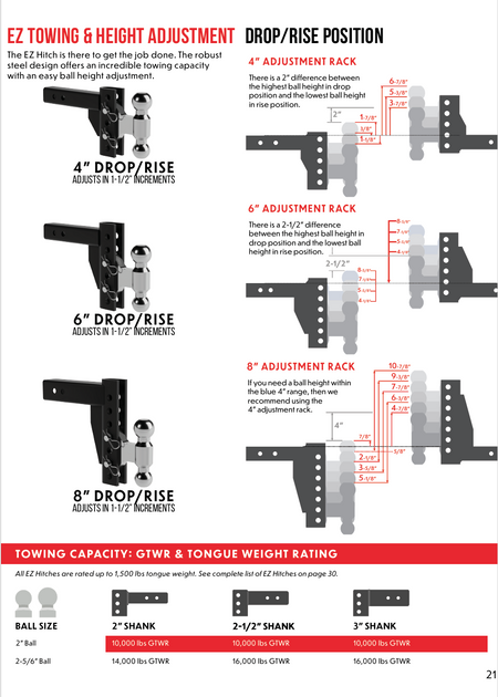 Each hitch features a heavy-duty rack and a specially-designed combo ball that provide you with unmatched strength and versatility in towing. And adjusting the towing height or switching the combo ball is still incredibly simple: just pull the pins, make the adjustment, and replace the pins.