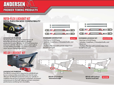 The HELUX Lockout Kit is required for All HELUX pin boxes and provides essential protection for your Ultimate 5th Wheel Connection and your vehicle. It stabilizes the pin box to prevent unwanted movement and pressure on the ball, helping maintain performance and long-term durability.