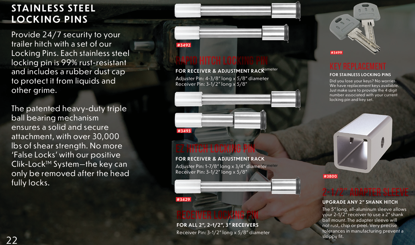 Provide 24/7 security to your trailer hitch with our Locking Pins. Each stainless steel locking pin is 99% rust resistant and includes a rubber dust cap to protect it from liquids and other grime